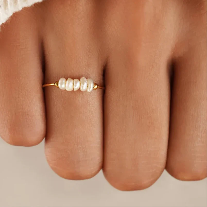 Lustrous pearls and a sleek gold finish bring a delicate touch to this ring, designed with a minimalist build and non-tarnish durability for a timeless appeal.