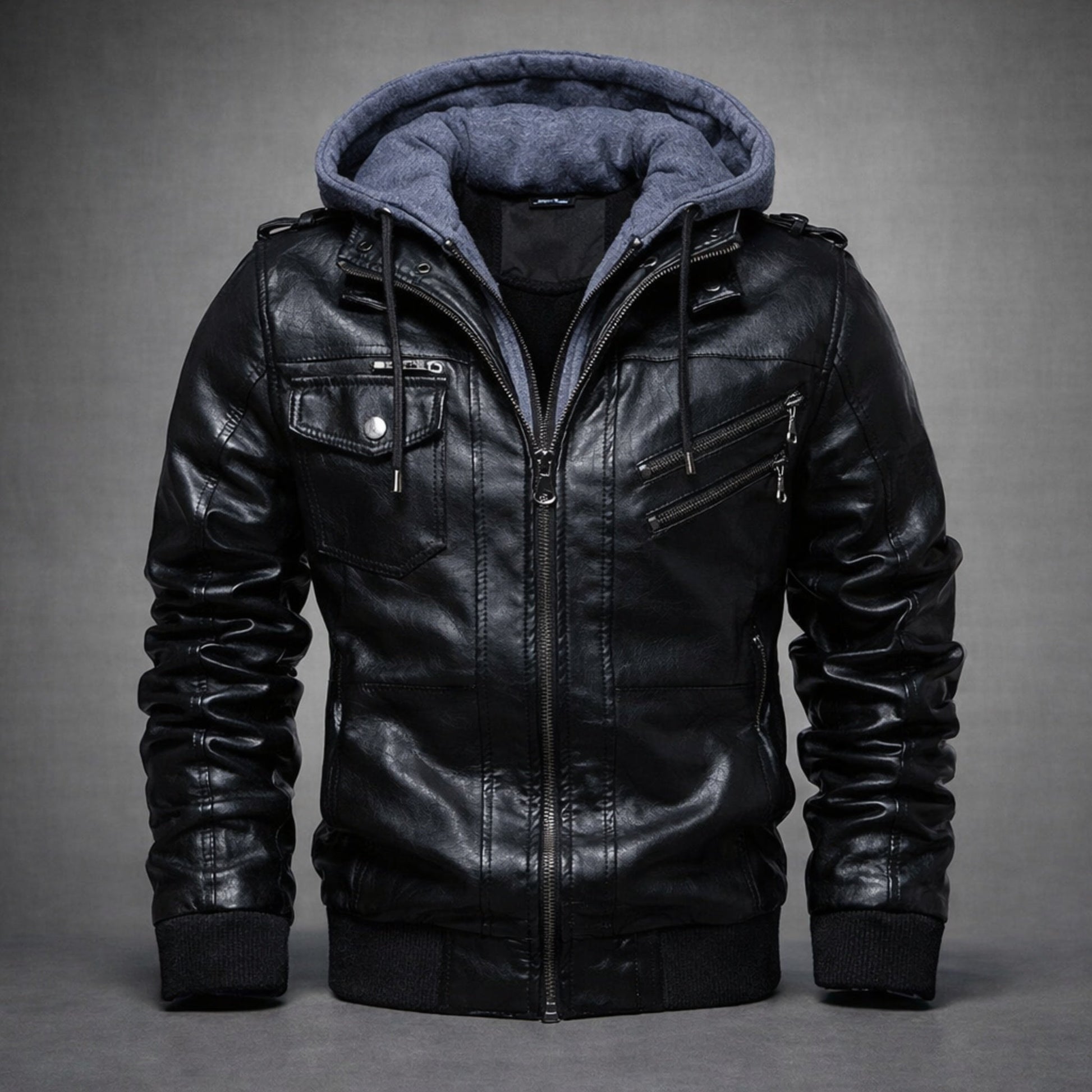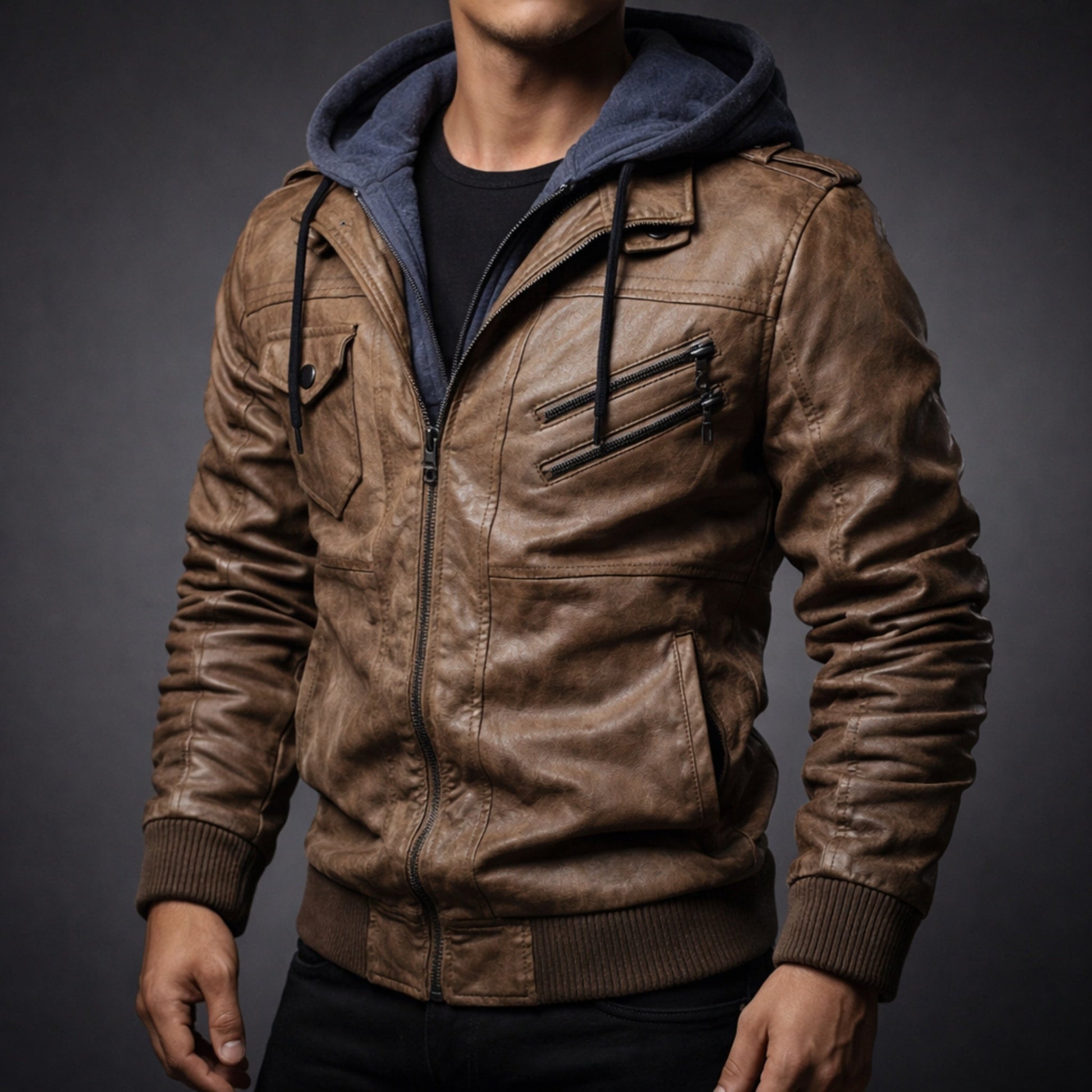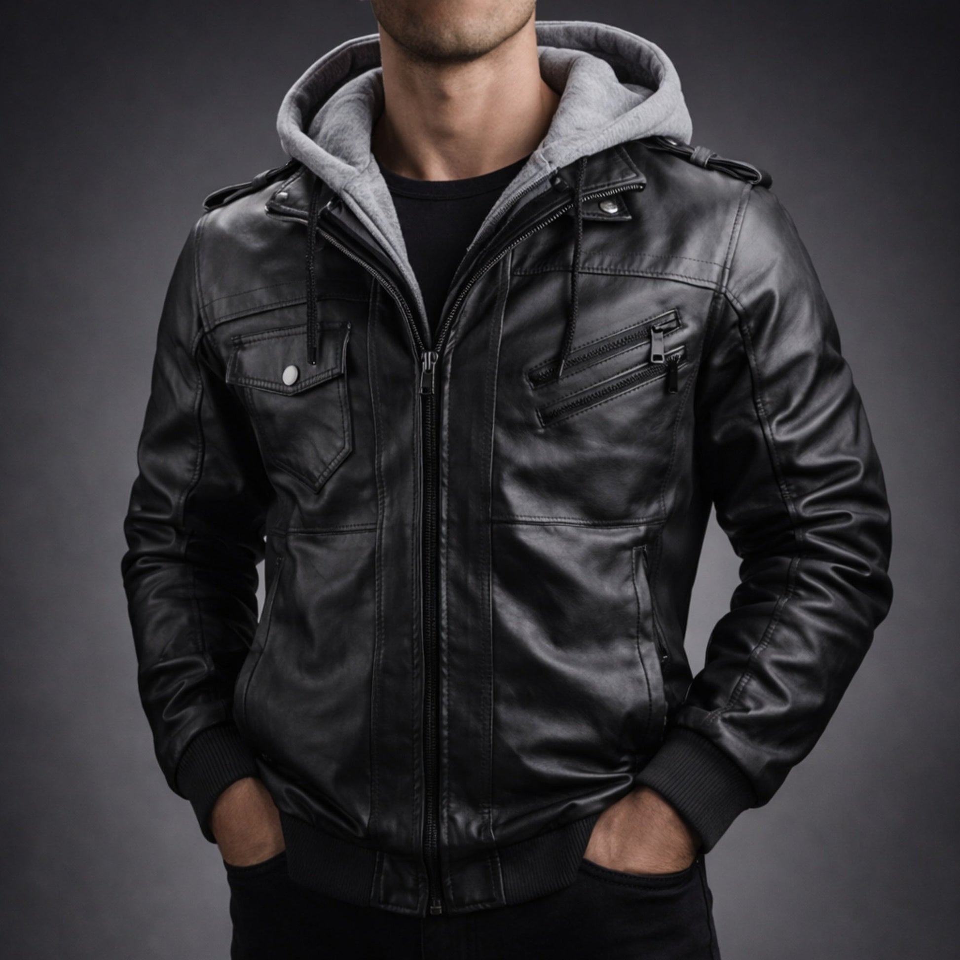 Rugged yet refined, this premium leather jacket features a sleek hooded design with classic zipper front and functional pockets for everyday style and convenience.