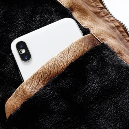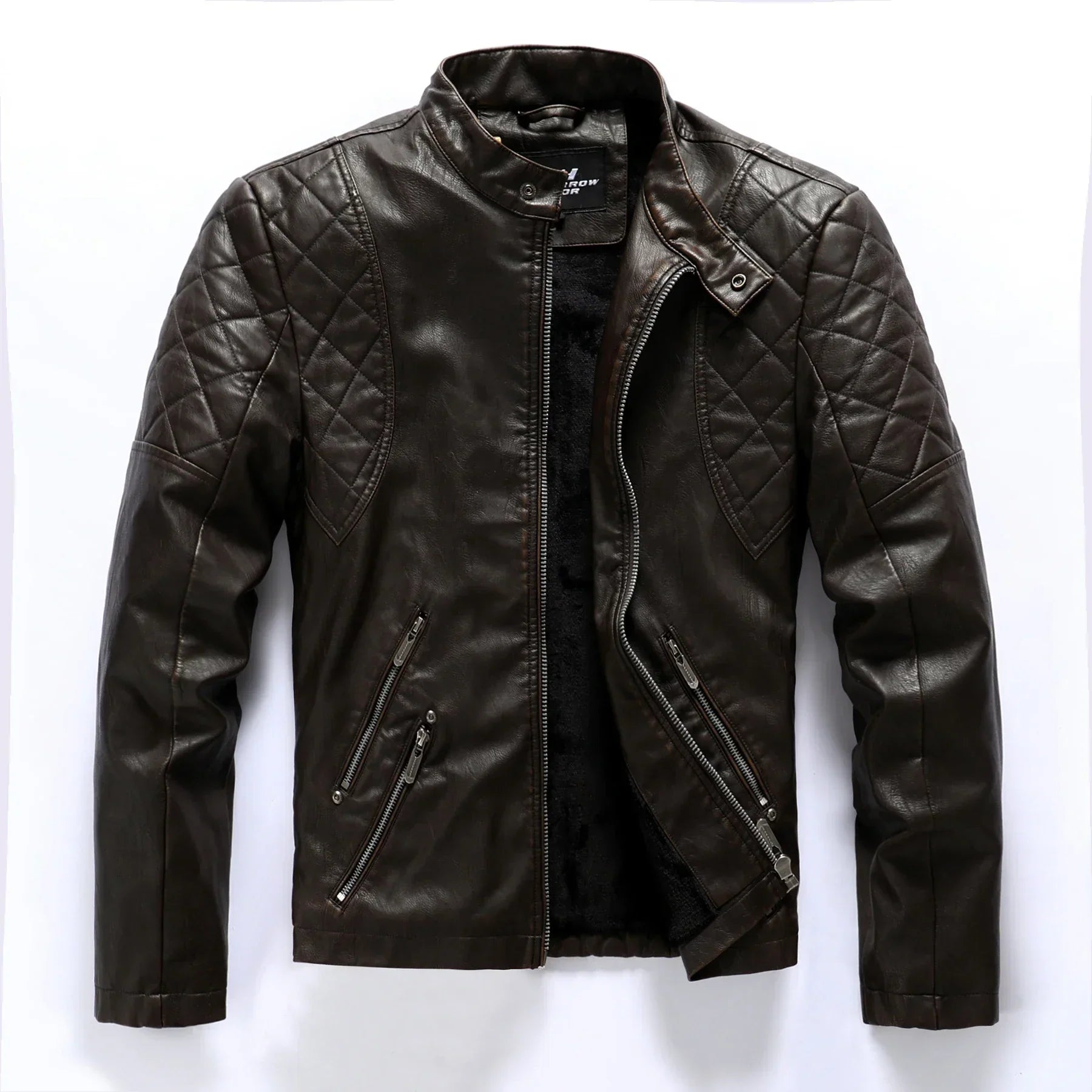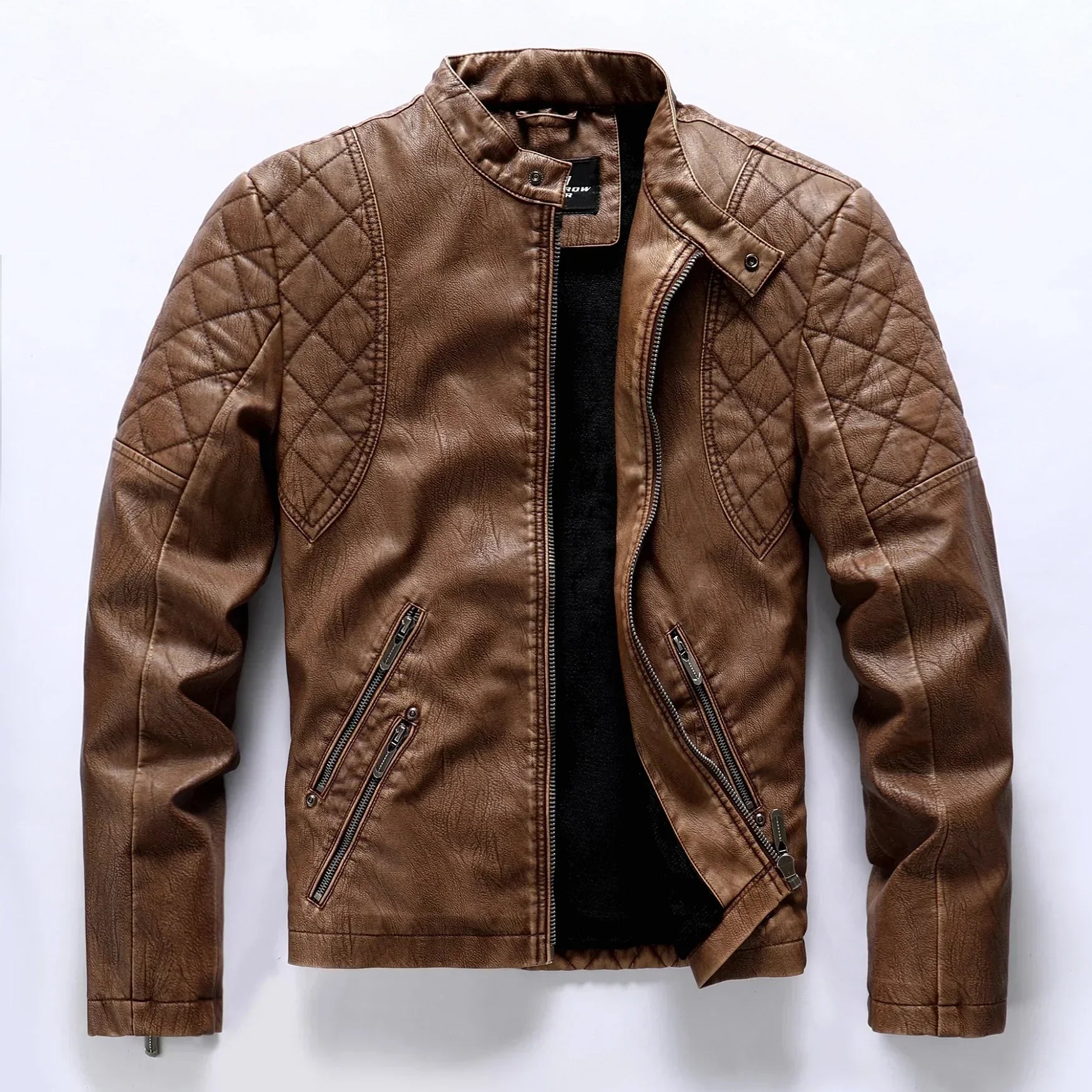 Moto-inspired stitching enhances the rugged charm of this cruelty-free leather jacket, complete with a snap band collar and secure zippered pockets.