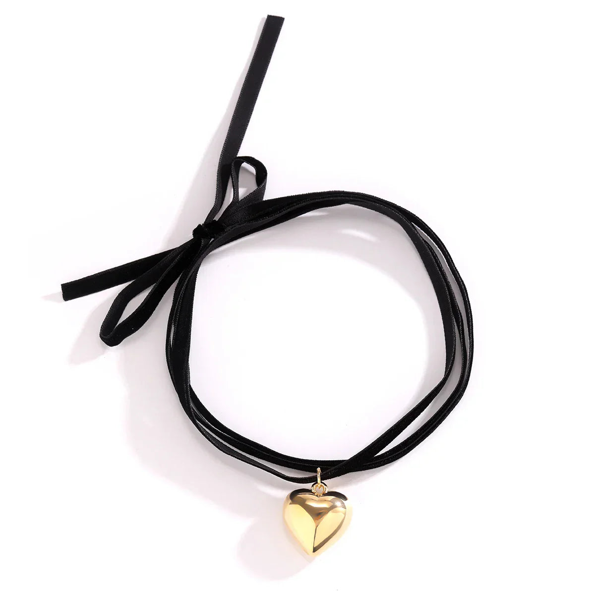 Delicate and romantic, this lace-up choker necklace features a beautiful heart charm resting elegantly at the center of the neck.