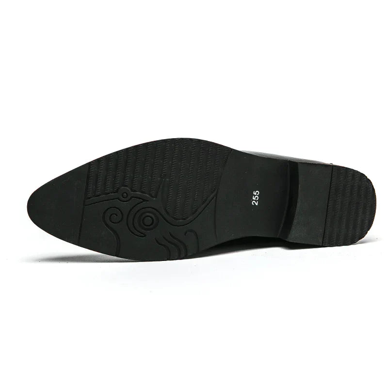 A sleek, polished loafer features a streamlined genuine leather silhouette, complemented by a premium textured heel counter that wraps around the sides, exuding timeless luxury.